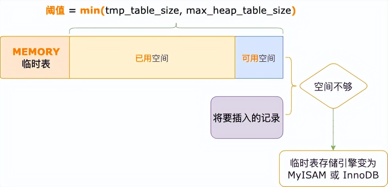 内存临时表已插入记录占用的空间,加上即将要插入的记录占用的空间,如果超过阈值,临时表的存储引擎会由内存存储引擎变为磁盘存储引擎。
