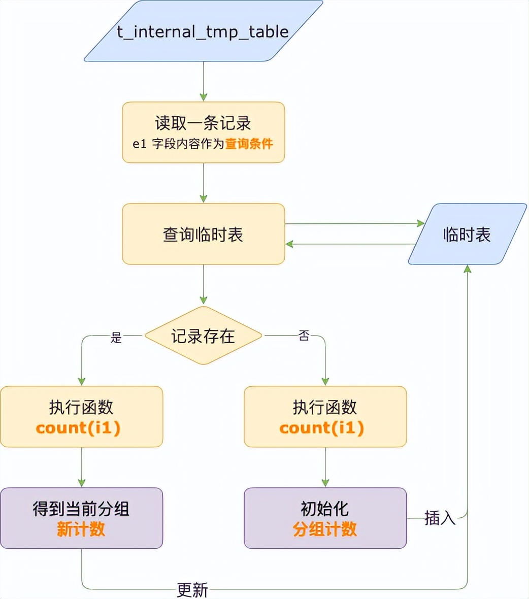 第 2 步,如果 e1 字段值对应的记录在临时表中已经存在,执行 count(i1) 函数得到当前分组新计数,然后把分组新计数更新到临时表。