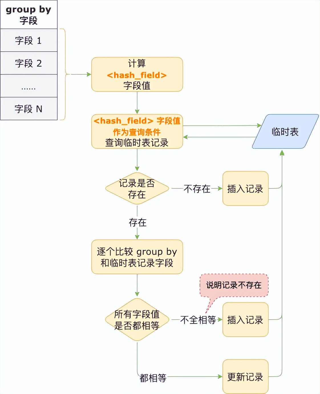 计算 group by、distinct 每一个字段的哈希值所有字段哈希值再经过计算得到的结果,作为 <hash_field> 字段值。第 2 步,用第 1 步中计算出来的 <hash_field> 字段值作为查询条件,到临时表中查找记录。