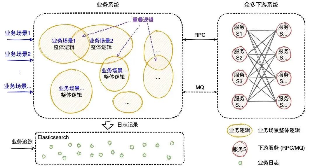 传统的ELK方案需要开发者在编写代码时尽可能全地打印日志,再通过关键字段从ES中搜集筛选出与业务逻辑相关的日志数据,进而拼凑出业务执行的现场信息。然而该方案存在如下的痛点: