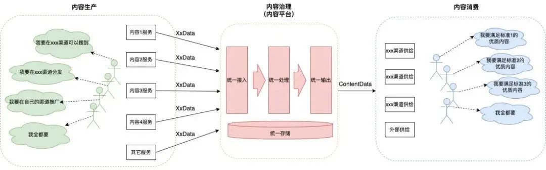 内容的生产方:希望生产的内容能在更多的渠道分发,收获更多的流量,被消费者所喜爱。内容的治理方:希望作为“防火墙”过滤出合法合规的内容,同时整合机器和人工能力,丰富内容属性。内容的消费方:希望获得满足其个性化需求的内容,能够吸引其种草,或辅助其做出消费决策。生产方的内容模型各异、所需处理手段各不相同,消费方对于内容也有着个性化的要求。如果由各个生产方和消费方单独对接,内容模型异构、处理流程和输出门槛各异的问题将带来对接的高成本和低效率。在此背景下,点评内容平台应运而生,作为内容流水线的“治理方”,承上启下实现了内容的统一接入、统一处理和统一输出: