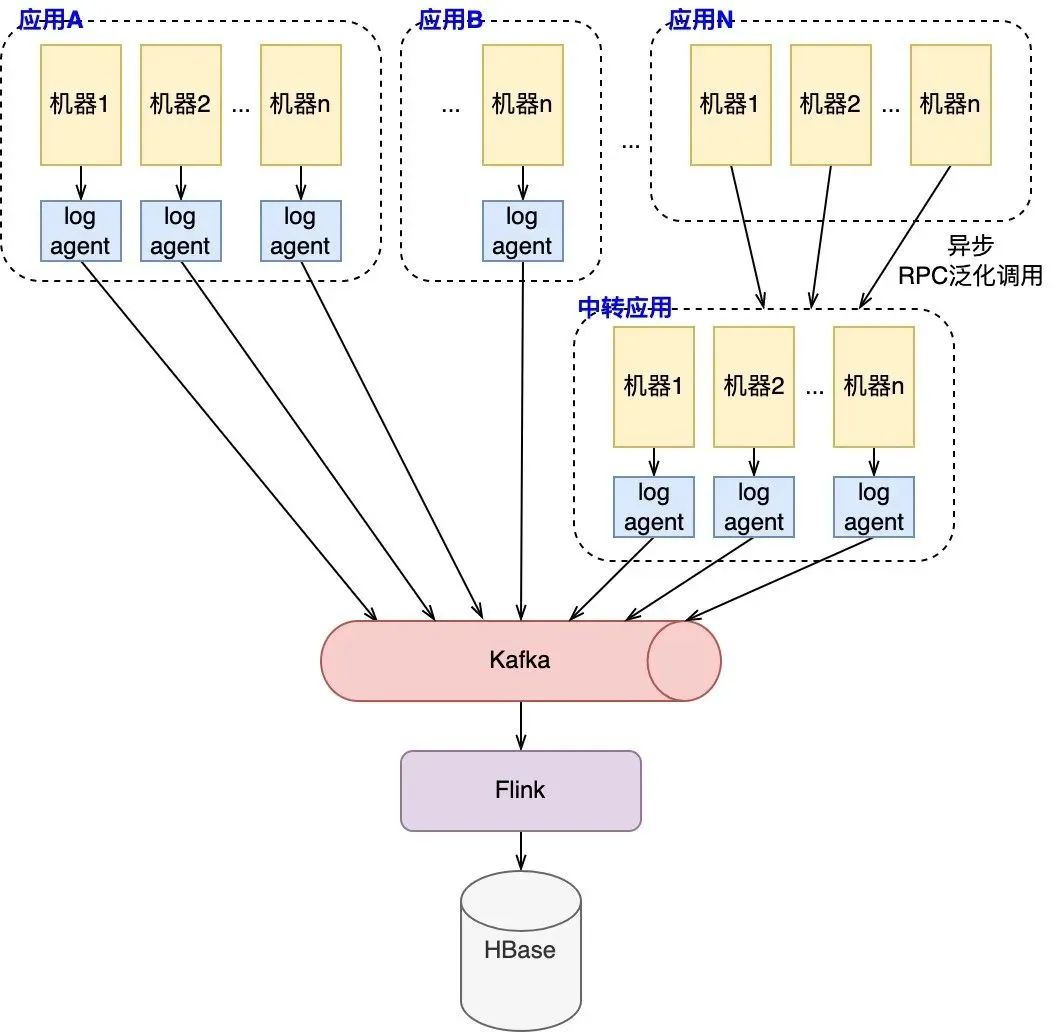 日志收集:各应用服务通过机器上部署的log_agent收集异步上报的日志数据,并统一传输至Kafka通道中,此外针对少量不支持log_agent的服务,搭建了如图所示的中转应用。