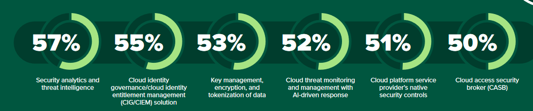 当被问及 “企业目前正在使用哪些工具来确保公有云环境的安全?”时,55%的受访者表示采取了CIG/CIEM方案作为其安全防护策略的一部分;57%的受访者表示正在使用安全分析和威胁情报工具;53%的受访者正在使用密钥管理、加密技术和数据凭证化(Tokenization)工具;52%的受访者正在使用具有AI驱动响应功能的云威胁监控和管理工具;51%的受访者在使用云平台服务商原生安全控制工具;50%的受访者在使用云访问安全代理(CASB)工具。这表明身份授权管理、访问权限路径管理和访问控制是公认的实现云环境安全的有效方案。
