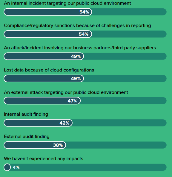 尽管企业目前正在使用多种工具来保护云环境安全,但有高达96%的受访者表示,他们的企业在过去一年中曾发生过安全事件,对这些事件进行详细调查后发现:其中有54%是云环境下的内部安全事件;54%是因安全事件上报问题而引发的合规、监管制裁;49%是涉及公司业务合作伙伴和三方供应商的事件;49%是由于涉及因云配置失误而丢失数据;47%来自于针对公共云环境的外部攻击;42%为内部审计发现;38%为外部审计发现;仅有4%的受访者表示没有受到任何影响。