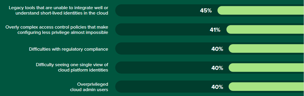 CIG/CIEM方案实施面临严峻挑战98%接受调查的IT团队负责人表示,他们面临着如何将CIG/CIEM方案有效集成到云上的相关挑战。具体原因为:45%的受访者无法在公共云环境中集成和使用这些工具,进而导致短期内身份识别无法完成,并导致了无法识别的身份和虚拟身份的泛滥;41%的受访者认为过于复杂的访问控制策略,让云上的身份权限管控更加难以把控;40%受访者认为在监管合规层面临挑战;40%的受访者表示无法实现云平台身份的可视化监管,进而无法满足企业在云中不断拓展变化的管理需求;还有40%的受访者担心一些云管理员的权限过高。