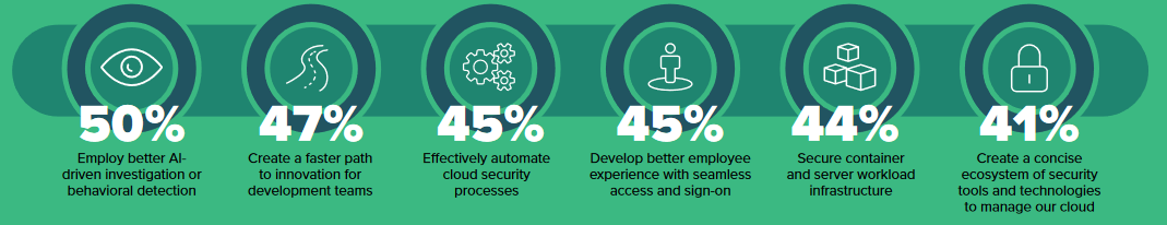 人工智能成解决难题的有效助力针对“企业云安全计划的首要目标是什么?”这一问题,50%的受访者认为应采用更先进的人工智能驱动调查或行为检测;47%受访者表示应为开发团队创造更快的创新路径;45%受访者表示应实施有效地自动化云安全流程;45%受访者表示应通过无缝访问和登录开发来提升员工使用体验;44%的受访者表示应采取安全容器和服务器工作负载基础设施;41%的受访者表示应创建简洁的安全工具和技术生态系统来管理云环境。以上这些调查结果均指向一个趋同的目标:IT团队负责人希望能事先预知风险并在事件发生时实现快速响应。