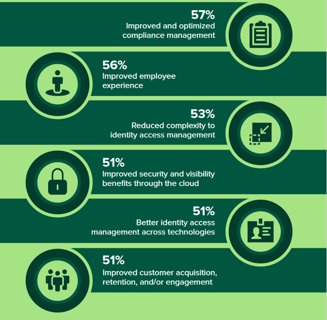 其中57%的受访者认为它能改进和优化企业合规管理;56%的受访者认为它能改善员工的使用体验;53%的受访者认为它能降低企业身份访问管理系统的复杂性;51%的受访者认为通过它可以提高安全性和可见性;51%受访者认为它可以提供跨技术的、更好的身份访问管理;还有51%的受访者认为它可以提高客户粘性、增加新客户的关注度和获取机会。