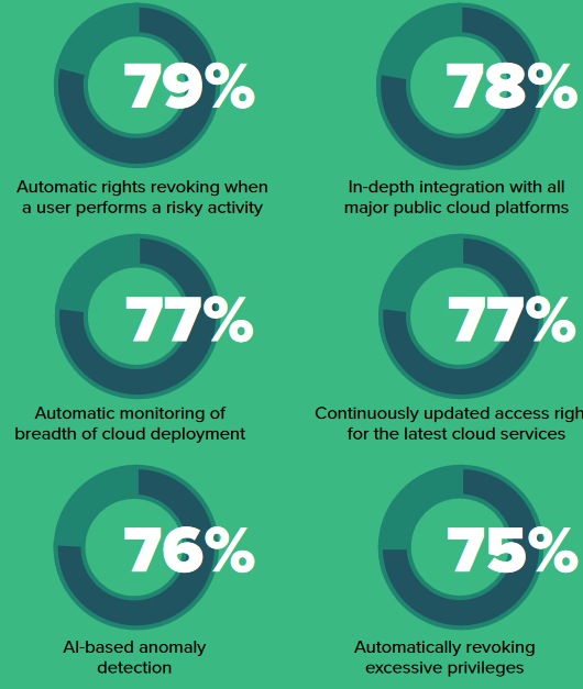 CIG/CIEM方案最受关注的功能是什么?与所有关键云平台实现集成,并执行自动权限撤销和监控任务是IT团队负责人在CIG/CIEM方案中最渴求的功能。具体调查数据显示: