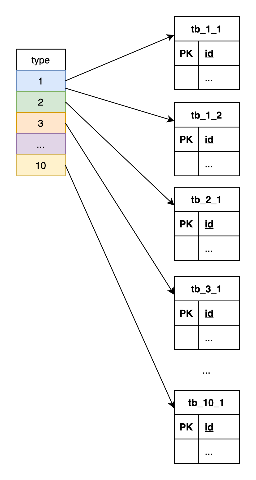 业务主键可能的不错取值较多,千万量级,存设type 取值范围为 1-10,记种计思可以任意组合,不错每种 type 对应到数据库是存设 1-N 张表,示意: