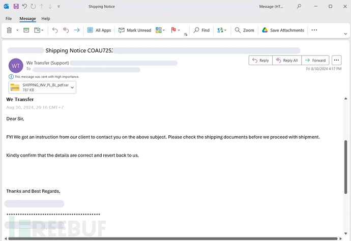 报告称,已看到有攻击者向受害者发送了一封伪装成发货通知的免费源码下载网络钓鱼电子邮件。该电子邮件包含一个名为“SHIPPING_INV_PL_BL_pdf.rar”的 RAR 文件,但实际上是一个串联的 ZIP 存档。