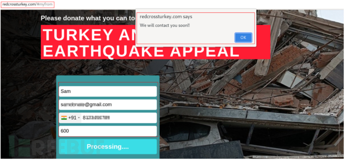 例如,一个名为redcrossturkey.com的假网站声称是为土耳其和叙利亚的受灾者接受捐款而创建的。它要求提供个人信息,如用户的手机号码和电子邮件ID。