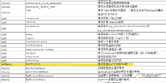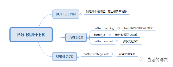 这类等待事件称为BufferPin,而这个等待事件大类里面只有一种等待事件,BufferPIN。这些锁之间都是什么关系呢?我们可以看上面的思维导图。