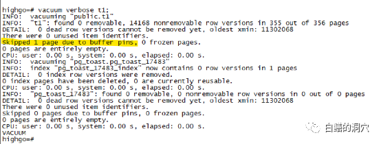 可以看到VACUUM跳过了被PIN住的BUFFER,因为针对PIN住的BUFFER,PG无法对其中的PAGE做VACUUM这样的不兼容的操作。