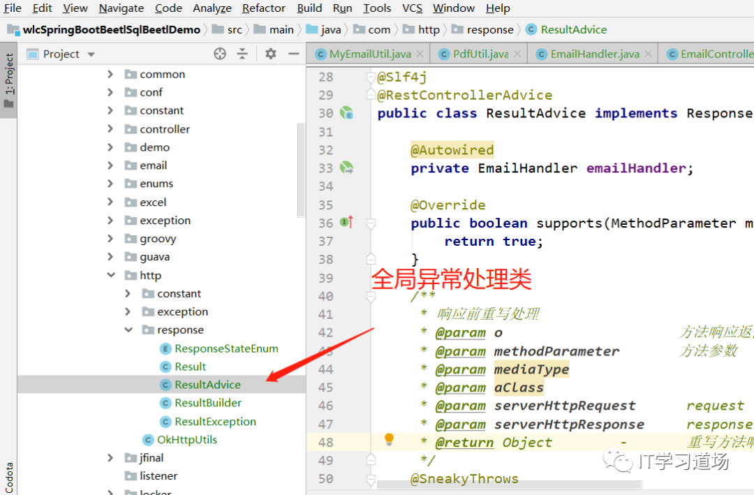 /** * 全局结果响应处理,全局异常处理 <br> * 作者:IT学习道场 <br> * 时间:2019-01-24 10:33 */@Slf4j@RestControllerAdvicepublic class ResultAdvice implements ResponseBodyAdvice<Object>{