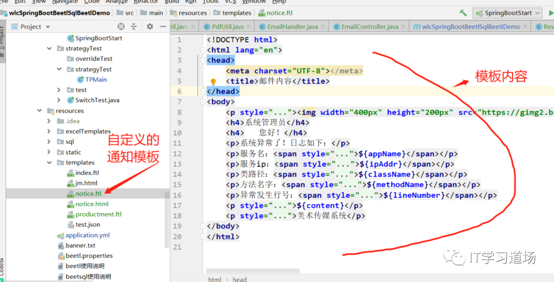 代码组成包含有自定义的模板的工具jar包和邮件的springboot-starter,以及在微服务中对异常的处理,和调用邮件的消息封装以及模板的创建。