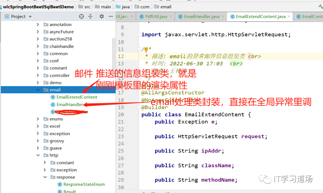 /** * 描述: email的异常邮件信息组装类 <br> * 时间: 2022-06-30 17:03 <br> * 作者:IT学习道场 */@Data@AllArgsConstructor@NoArgsConstructor@Builderpublic class EmailExtendContent{