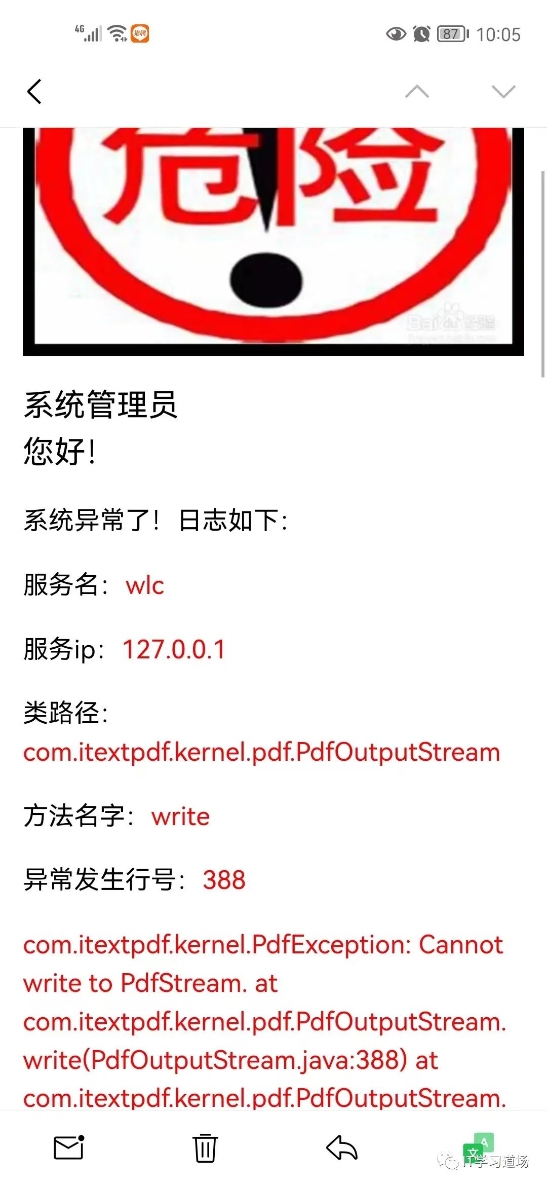 }1.2.3.4.5.6.7.8.9.10.11.12.13.14.15.16.17.18.19.20.21.22.23.24.25.26.27.28.29.30.31.32.33.34.35.36.37.38.39.40.41.42.43.44.45.46.47.然后就可以在全局异常里调用一下 EmailHandler.sendExceptionEmail即可。