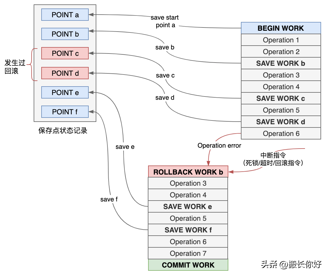 带保存点的扁平事务就是,除了支持扁平事务的操作外,允许事务执行过程中回滚到该事务较早的一个状态,而这个较早的状态就是保存点来记录的。