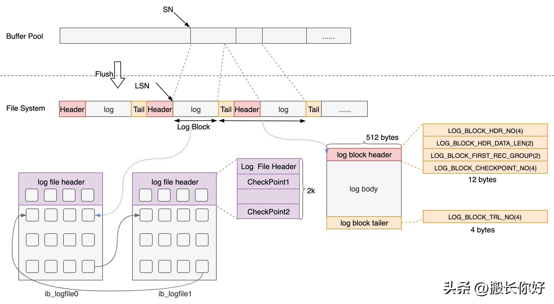 重做日志在Buffer中是连续写入的,Buffer中的数据会适时地刷新到物理文件中;文件顺序写入,每个事务的重做日志追加到文件末尾;单个文件大小固定,写满以后会切回到文件组的下一个文件;重做日志文件组的文件个数是固定的,写完最后一个文件则继续回到第一个文件开始写入;每个重做文件有固定2K的文件头,文件头的之后是以一个个512bytes的Block,每个Block有16bytes的头尾信息;重做日志有一个全局的日志序列号(LSN:Log Sequence Number),单调递增,表示事务写入的重做日志的字节总量,也就是一个日志偏移量。重做日志记录了事务的行为,可以在需要的时候对页进行“重做”,但是事务有时是需要被回滚的,当语句执行失败或者用户请求回滚,就可以通过undo log将数据回滚到修改前的样子,undo log是存储了行记录的变更。其主要包含两类undo log:
