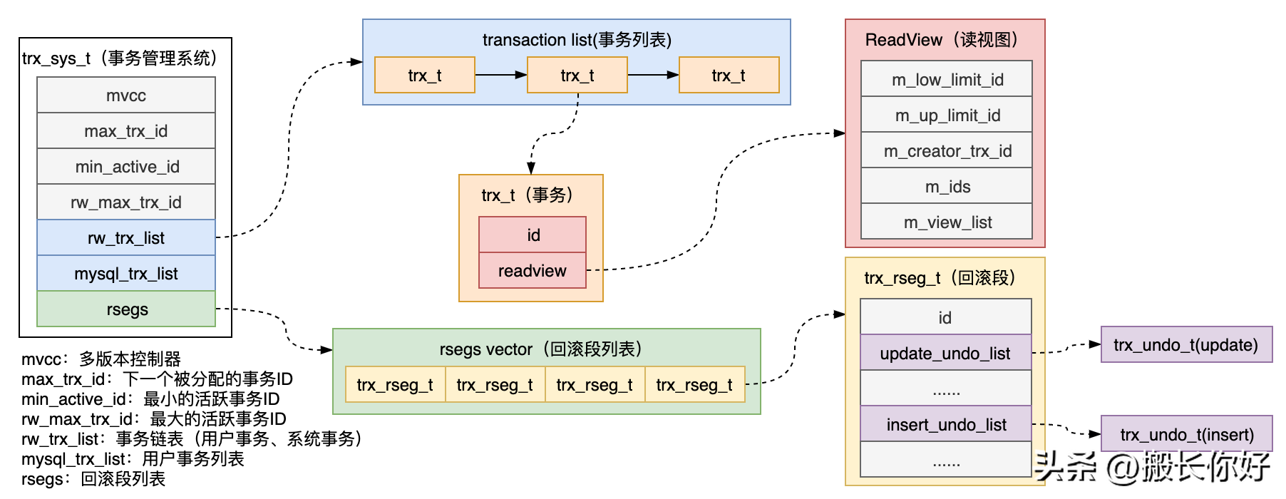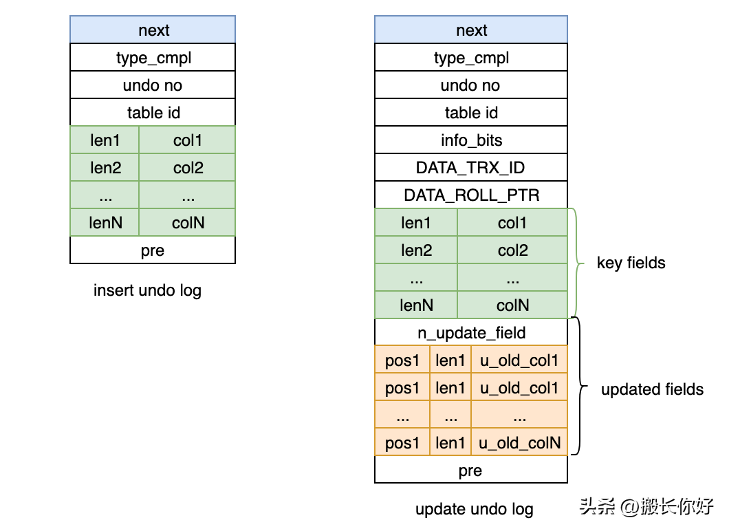insert undo log:insert操作时产生,只对当前事务本身可见,在事务提交之后可直接删除。update undo log:delete与update操作产生,需要提供历史版本,为后续章节要讲到的MVCC服务,其交由purge线程统一删除。undo log需要通过group commit 操作将数据fsync到磁盘,以保证事务的持久性。下面是一个事务与undo log的关系结构: