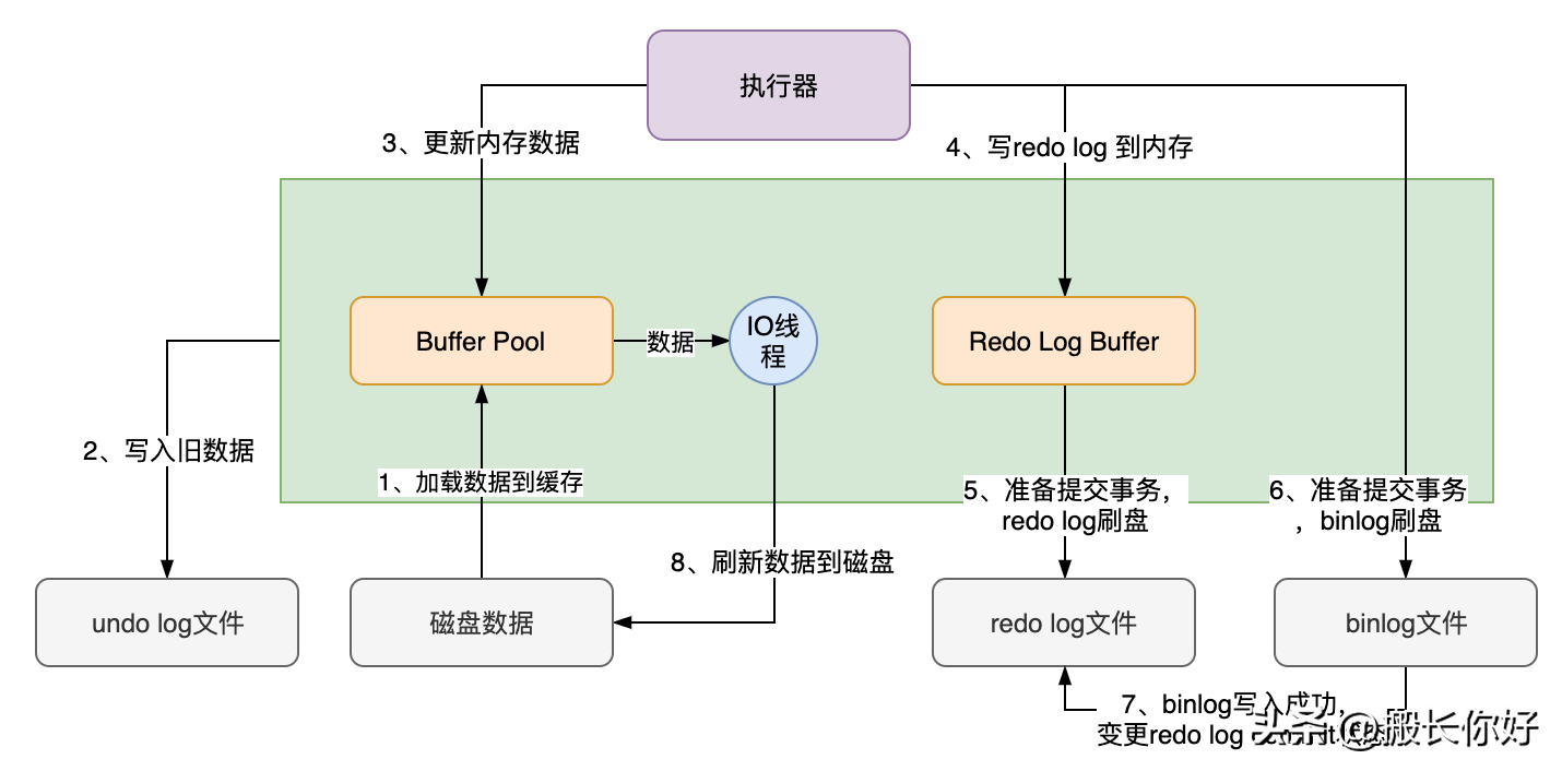 查询数据,若数据不存在于buffer,则从磁盘加载;数据更新前,先将当前数据记录到undo log重,以便后续可能出现的回滚做准备;更新Buffer Pool中的数据;将更新的数据写入到Redo Log Buffer中;准备提交事务,调用fsync将Redo Log Buffer的数据写入到redo log文件中,状态记为prepared;准备提交事务,binlog写入到磁盘中;binlog写入成功后,将redo log的状态更新为commit;binlog的开启时会存在一个内部XA的问题(binlog是在MySQL层,而redo log在存储引擎层),这里引入了2PC(二阶段提交):