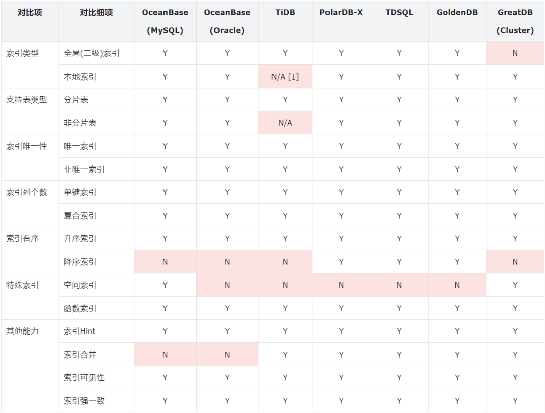 (7)其他能力索引的其他能力,这里列举了几种常见的。一是索引提示,针对复杂数据访问场景或优化器尚不稳定时,提示是一种有效的应急/规避手段。上述产品也都支持了此功能。索引合并,是指 Index Merge 功能,大部分产品已经支持,少数产品还不行。索引可见性则是指优化器是否忽略该索引,这对于索引维护、系统优化有一定帮助,上述产品也都支持了。最后则是索引强一致,这也是对索引的最基本要求,也是数据库与中间件产品的差异,上述产品也都支持。