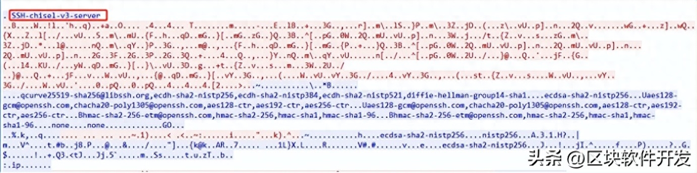 WebSocke连接建立后,chisel工具会在WebSocket信道内进行SSH加密协商,协商中SSH的版本信息为“SSH-chisel-v3-server”。和WebSocke升级协议类似,其中包含了chisel工具的特征字符串,可以通过该特征实现检测,但该特征也较易被攻击者抹去。站群服务器