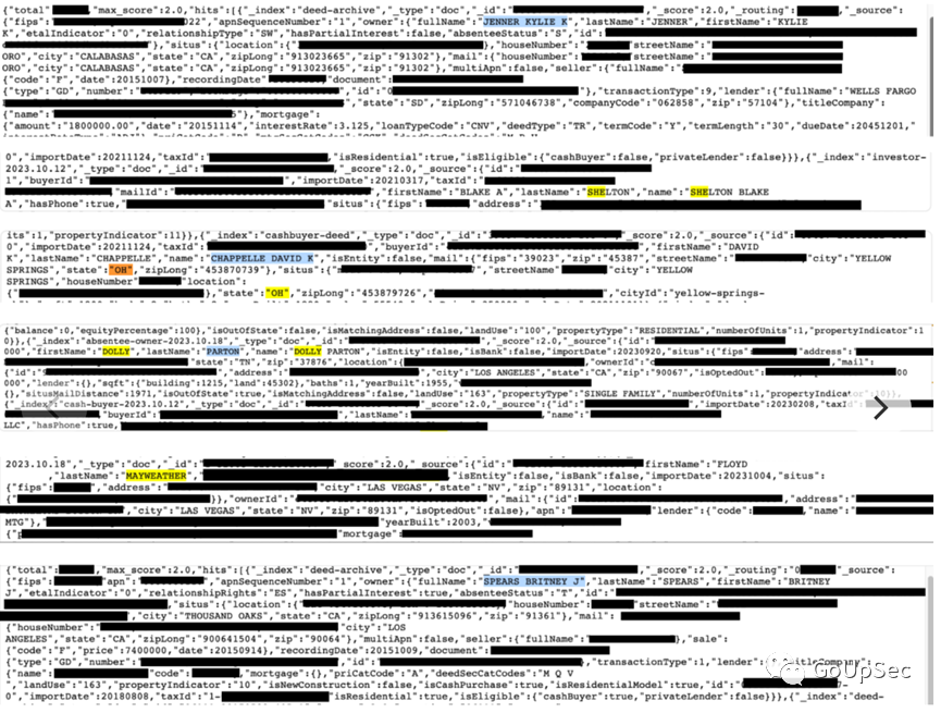 经过研究人员检查,在数据库中发现大量文娱明星、政商大佬的房产数据,包括凯莉·詹纳、高防服务器布莱克·谢尔顿、布兰妮·斯皮尔斯、弗洛伊德·梅威瑟(世界拳王)、戴夫·查佩尔、埃隆·马斯克(特斯拉创始人)、多莉·帕顿、唐纳德·特朗普、马克·沃尔伯格和南希·佩洛西的房产数据都被泄漏。研究者能够看到他们的街道地址、购买价格和日期、抵押贷款公司、抵押贷款金额、税号、所欠税款、已付税款或到期税款以及其他信息。