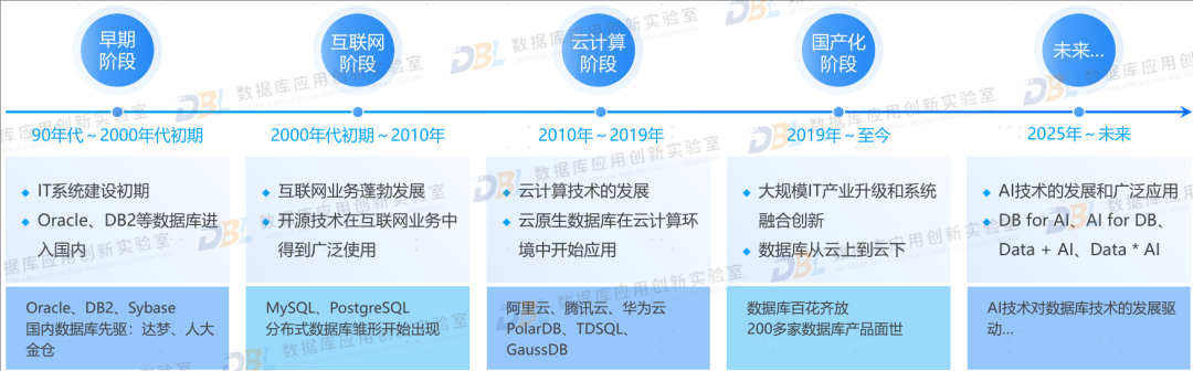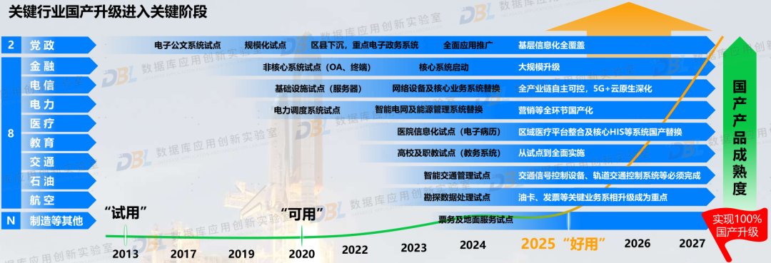 从数据库发展来看,如下图所示经历了几个阶段。目前我们正处于一个交叉的阶段,一方面以国产信创升级为代表,这几年开始步入关键期(如下下图),国产数据库很多也都吃到了红利;另一方面是AI技术的发展与应用,近一两年开始进入活跃期,正开始影响了数据库行业的整体发展。如果说前者代表着现在,那么后者就预示了未来。国产数据库正以信创为起点,打下基础,为后续AI时代真正带来做好准备。