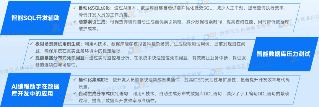 从甲方用户来讲,AI 更多是赋能数据库的使用。无论是之前的数据库使用者、开发者,都可以从AI中受益。特别是一些较大的数据库甲方,可以尝试自建数据库智能运维体、智能开发平台等。