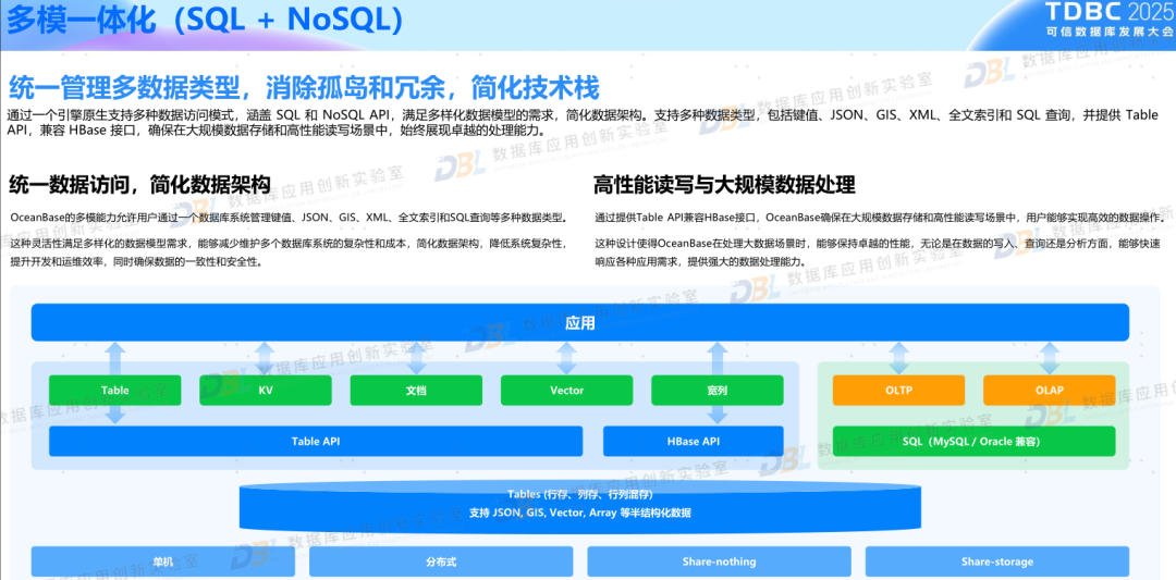 此次大会上,很多数据库厂商都不约而同提到了融合或一体化的理念,但各家的定义有所区别。有的是架构一体化,包含从单机、主备、共享与分布式;有的是模型一体化,提供多模数据存储与统一访问;有的是计算一体化,将关系查询SQL与智能处理AI结合在一起;有的则强调是场景的一体化,通过单一产品适应不同场景。这其中背后的逻辑都是一样的,那就是尽量简化使用者的技术栈,通过一系列一体化能力,简化选型、简化使用、简化管理。