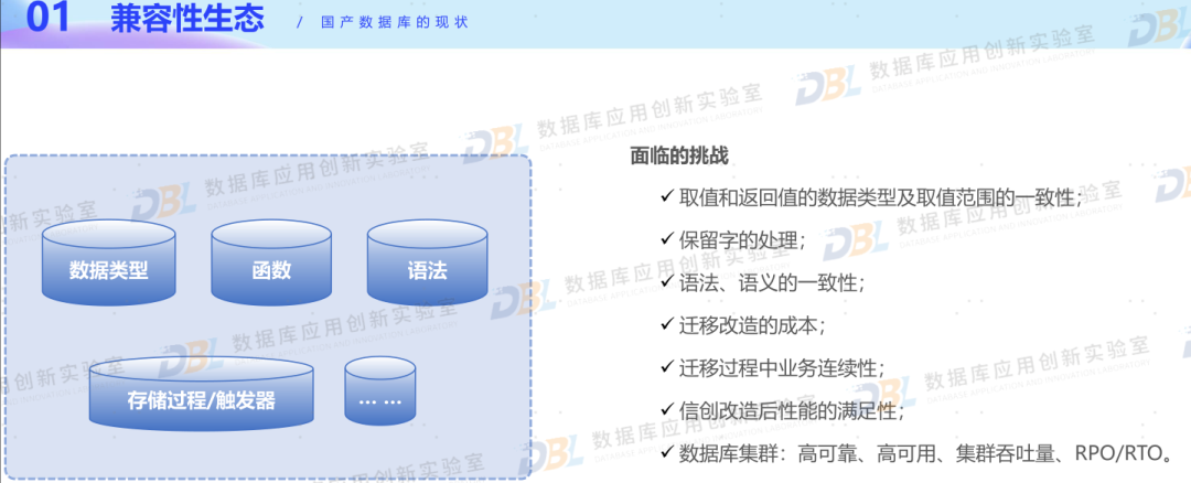 几乎所有厂商都谈到了兼容性,并且都罗列出了兼容能力。这里有一个误区,就是兼容性本身就没有标准范围,大家各自谈到的兼容性外延各不同。常见的就是语法兼容性(包括类型、函数、过程等),还有则是更高层级的语义兼容、生态兼容,甚至还包括不算兼容的兼容性能力(如性能不衰退等等)。比较可喜的是,各家一方面都比较重视兼容性,一方面也都通过工具等手段将不兼容的情况提前识别出来。那么从用户角度来讲,要有一个清醒的认识,就是没有两款产品是完全兼容的,不兼容的情况是一定,要做好不兼容的各种预案,包括预留必要的资源来改造。