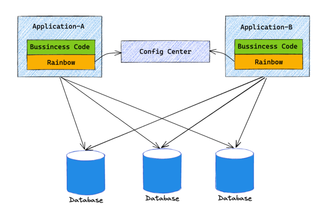 主要针对不熟悉彩虹桥的同学,这里做一下简单介绍。彩虹桥用一句话概括就是基于Apache ShardingSphere二次开发的透明化数据库中间件,通过数据分片、读写分离、影子库、加解密等能力对原有数据库进行增强。目前得物内部主要采用的中心化部署架构和非中心化部署2种方式。