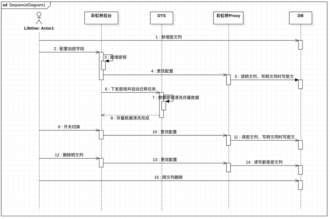步骤2~5主要是新增加密规则,让彩虹桥实现增量的数据的双写(明文列、密文列同时维护),此时查询还是用的明文列。