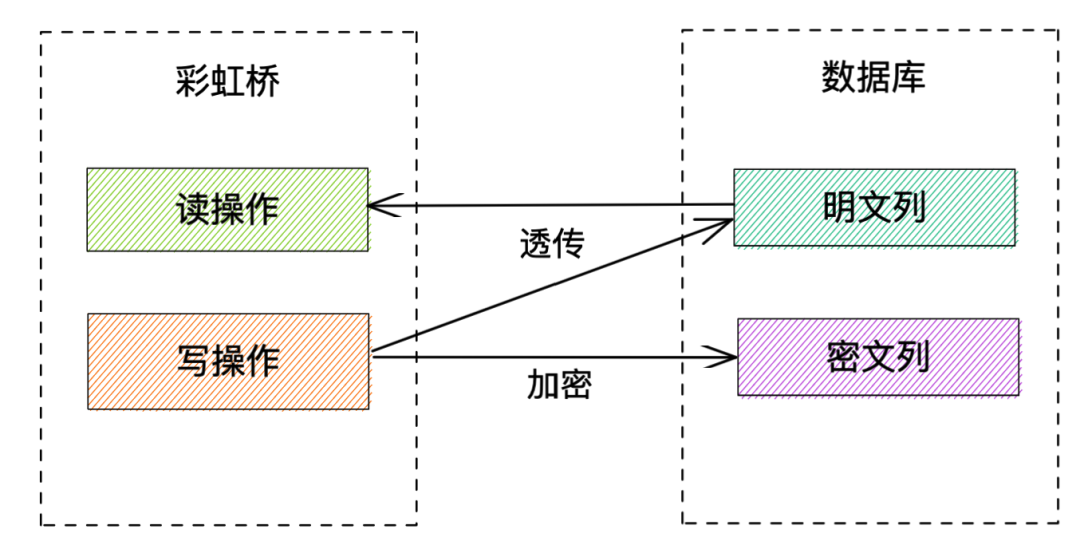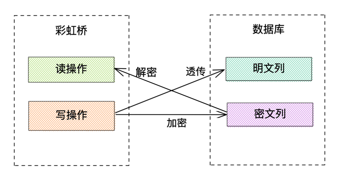 这里的明文列可能比较难理解,这里单独解释一下,明文列主要用于在加密数据迁移过程中仍旧提供服务,在洗数结束后可以删除。因为已上线业务改造前,数据库里面存储的只有明文,在改造过程前几个阶段查询所用列都是明文列。一般来说明文列可以与逻辑列保持一致。