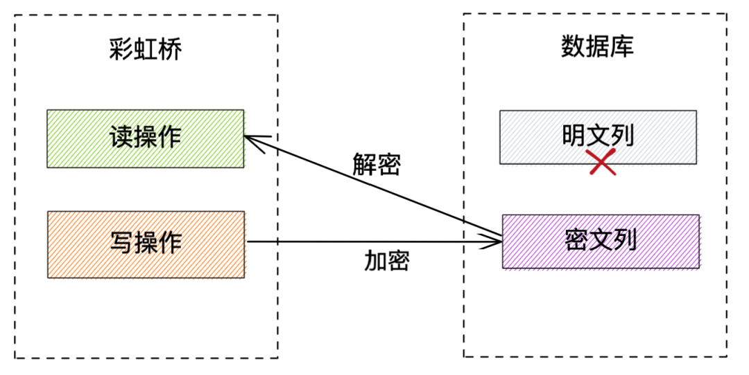 复制-- 查询 ---- 业务代码中的SQLselect phone from t_user where phone = 10086-- 经过彩虹桥改写后实际去数据库执行的SQLselect phone_cipher as phone from t_user where phone_cipher = xxx1.2.3. 复制-- 更新 ---- 业务代码中的SQLupdate t_user set phone = 10000 where id = 1-- 经过彩虹桥改写后实际去数据库执行的SQLupdate t_user set phone = 10000, phone_cipher = xxx where id = 11.2.3.第三阶段(步骤12~14)- 停止写明文列,只写密文列
