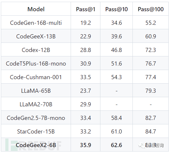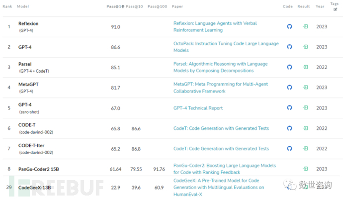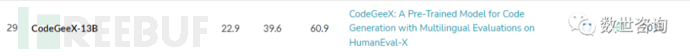 清华大学开源的CodeGeeX-13B,其Pass@1得分为22.9分,排名29