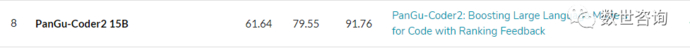例如,PanGu-Coder2 15B,其Pass@1得分为61.64,而Pass@100得分高达91.76分。排名第八,紧随GPT系列,相关论文为” PanGu-Coder2: Boosting Large Language Models for Code with Ranking Feedback”: