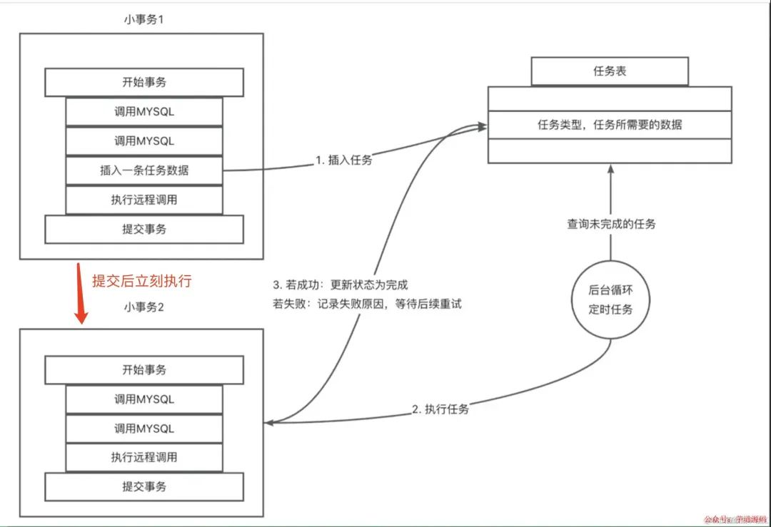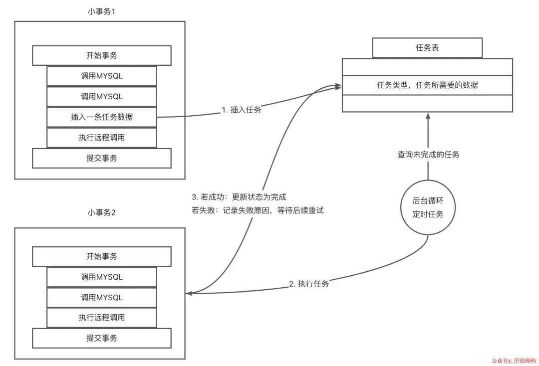 小事务内,尽量只有一个远程写操作该远程写操作放到方法最后,保证在其返回成功后就能立刻提交事务小事务可能会因为某些原因失败,因此需要机制来进行重试整体思路就是这样:
