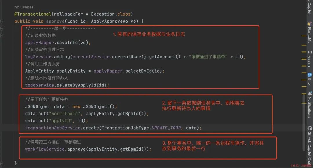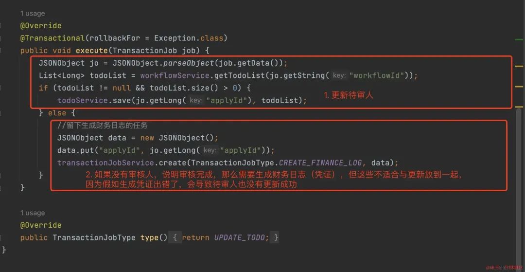 第三步,改造业务代码,不再一次性把流程写完,而且是在第一个小事务中,顺便往transaction_job中插入一条数据,以执行第二个小事务。