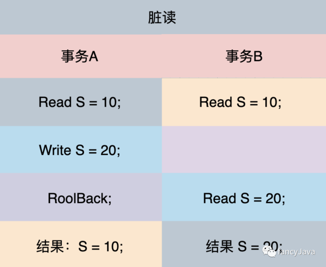 假设A和B同时读取一个数据,事务A读取到这个数据的值为10,随后将其值修改为20,按道理,事务A对这个数据的修改在事务未提交之前是不会被其他事务看到的,但是由于数据库的隔离性未能保证,此时事务B也去读取这个数据的值,就会直接读取到事务A修改完之后的值20,那么此时如果事务A进行了数据的回滚,不提交了。那么事务B最终读取到的就是一个过期的值20。