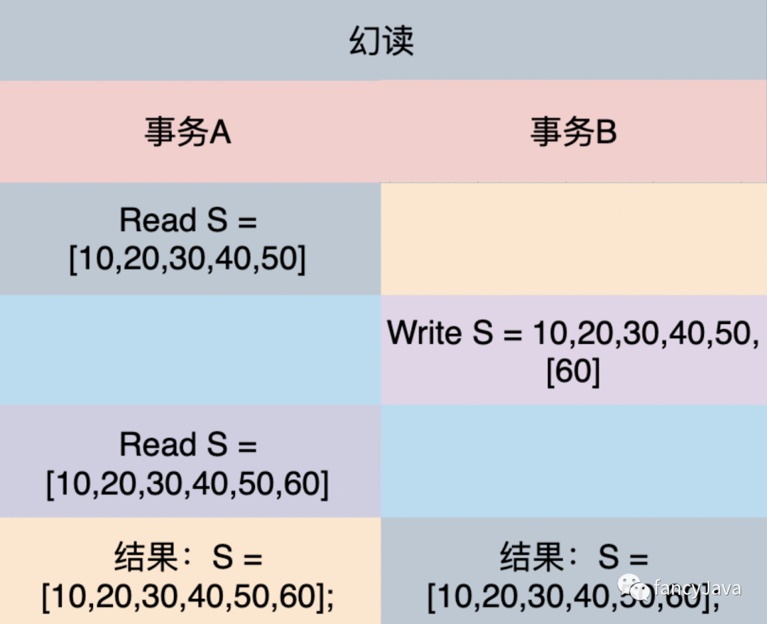 事务A根据条件查询到某个范围的数据[10,20,30,40.50],此时B在这个符合条件的范围内插入新的数据,A再次读取这个范围的数据后,发现该范围多出了一条数据60,此时就发生了“幻读”现象。幻读现象发生的本质,也是由于事务的隔离型未能保证导致的。