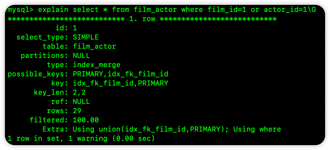 复制explain select * from film_actor where film_id=1 or actor_id=1;1.执行结果如下: