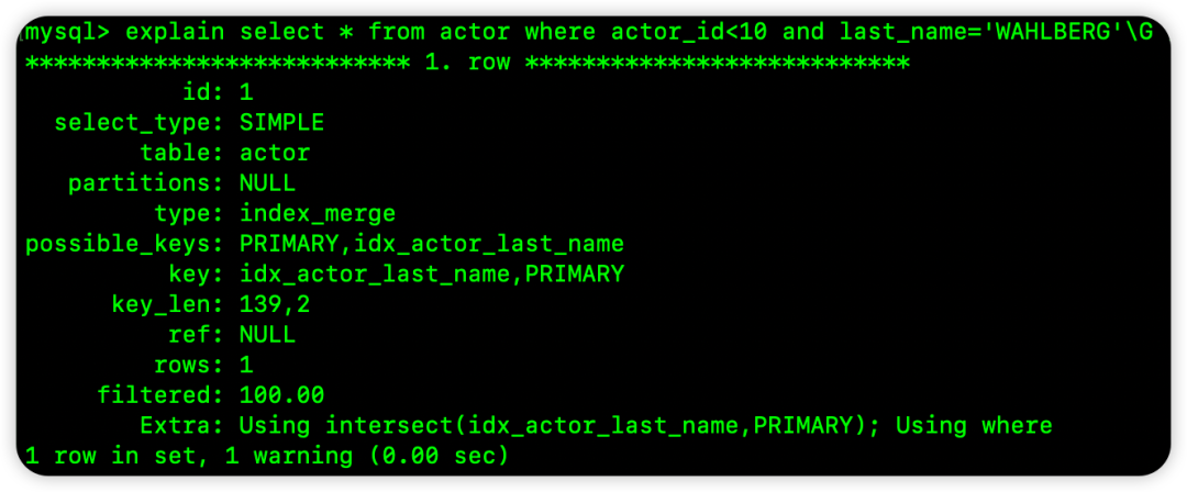 小伙伴们看到,此时 type 是 index_merge,possible_keys 和 key 中,都给出来了两个索引,Extra 中的值为 Using union(idx_fk_film_id,PRIMARY); Using where。
