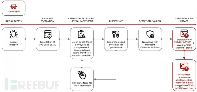 将“ESX Admins”组添加到域并添加用户。将域中的任何组重命名为“ESX Admins”,并将用户添加到组或使用现有组成员。ESXi 虚拟机管理程序特权刷新(为其他组分配管理员权限不会将其从“ESX 管理员”组中移除)。到目前为止,该漏洞已被被追踪为 Storm-0506、Storm-1175、Octo Tempest 和 Manatee Tempest 的勒索软件运营商在野外利用,并在攻击中部署了Akira和Black Basta勒索软件。例如,Storm-0506 在利用 CVE-2024-37085 漏洞提升权限后,在一家北美工程公司的高防服务器 ESXi 虚拟机管理程序上部署了 Black Basta 勒索软件。