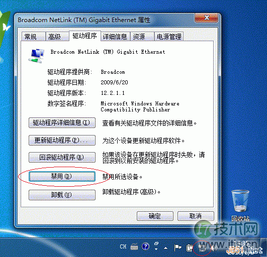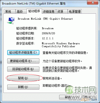 3. 双击网卡,进入属性窗口,并且切换到【驱动程序】标签,点击【禁用】,如下图: