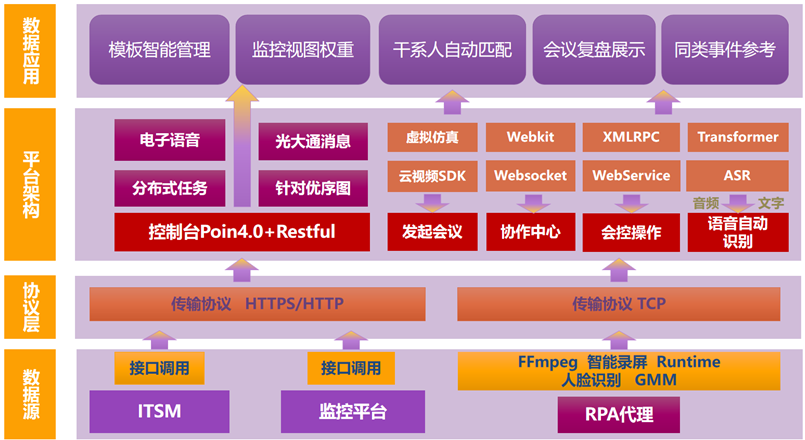 3. 协作处置的标准化能力基于事件、变更、灾备等领域运维人员积累的处置经验,在决策信息收集、工具预案执行等方面,为不同场景、不同领域人员在特定时点需完成的标准动作进行提示或提供参考,从而提升协做处置过程的质量和效率。通过人脸、声纹等生物识别技术,语音转文字等手段,结合场景特点定制界面操作,替代原有的文字输入、身份验证等繁琐操作。