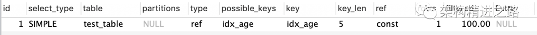 CREATE TABLE `test_table` ( `name` varchar(32) DEFAULT NULL, `desc` varchar(32) DEFAULT NULL, `age` int(16) DEFAULT NULL, `id` bigint(11) DEFAULT NULL, KEY `idx_age` (`age`) ) ENGINE=InnoDB DEFAULT CHARSET=utf8mb4;存在索引 `idx_age` 的情况下,查询执行计划如下: