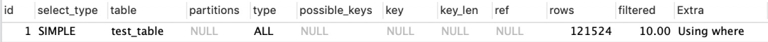 预估访问1行数据即可命中数据,如删除有效索引 `idx_age` 后则会变成全表扫描(ALL),预估需要扫描121524条记录才能完成这个查询,如下图所示: