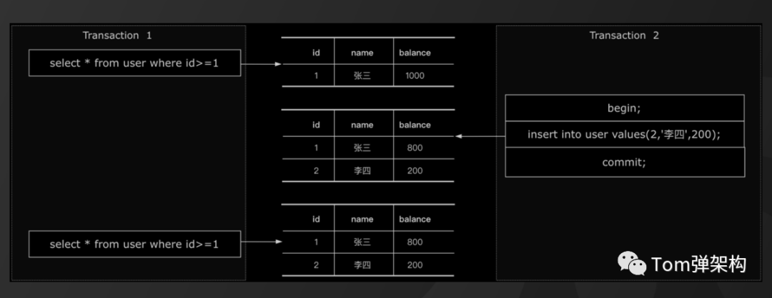 假设有两个事务T1/T2同时执行,事务T1执行范围查询或者范围修改的过程中,事务T2插入了一条属于事务T1范围内的数据并且提交了,这时候在事务T1查询发现多出来了一条数据,或者在T1事务发现这条数据没有被修改,看起来像是产生了幻觉,这种现象称为幻读。